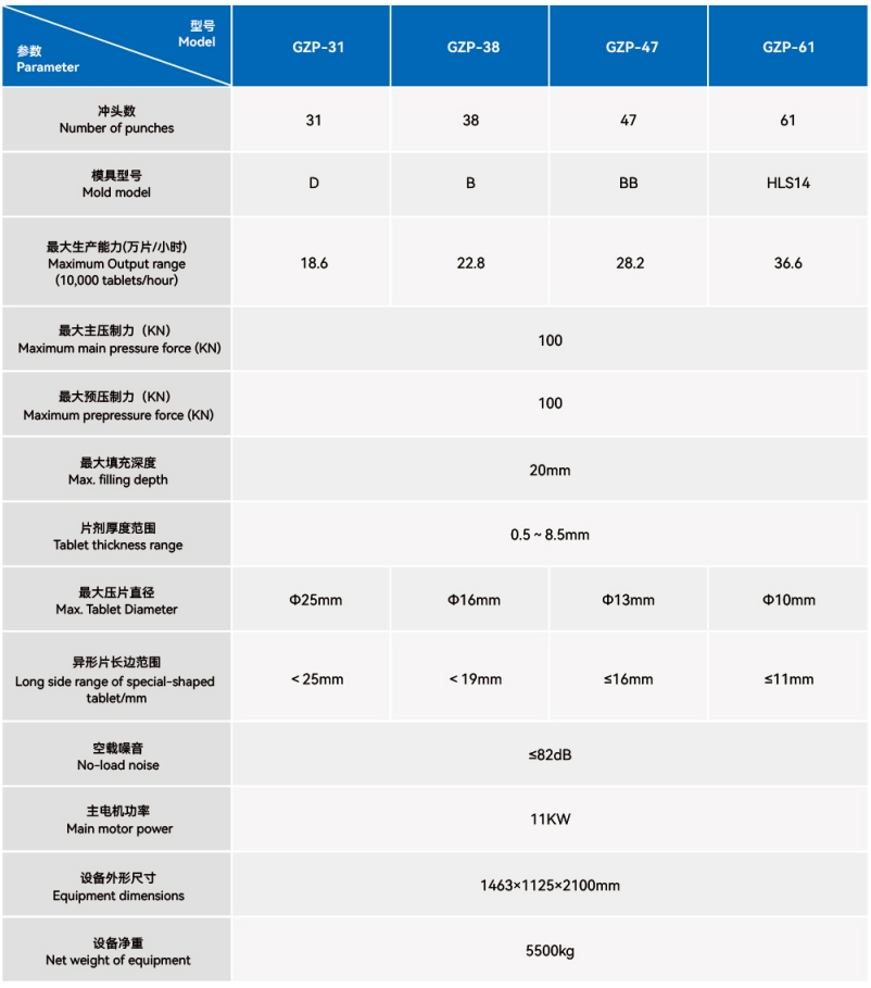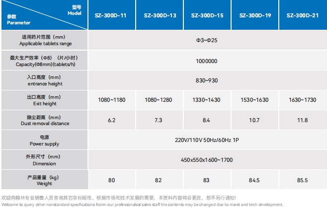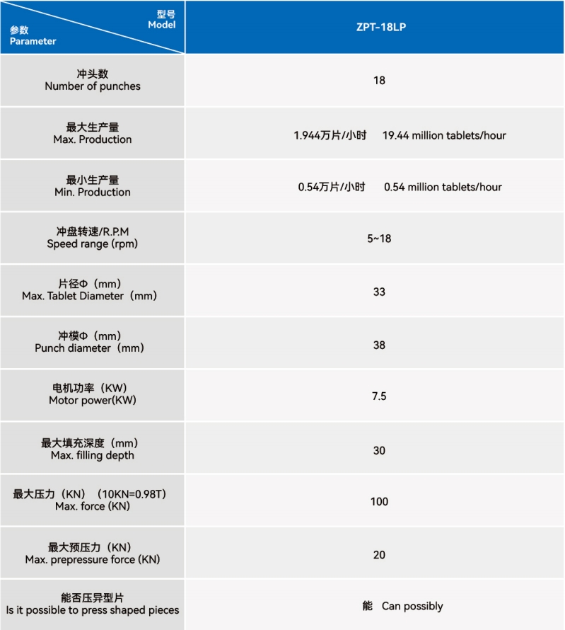 | 出产效力(片/小时) | 除尘间隔 | 最大药片直径 | 功率 | 电源 | 乐音 | 形状尺寸 | 分量 |