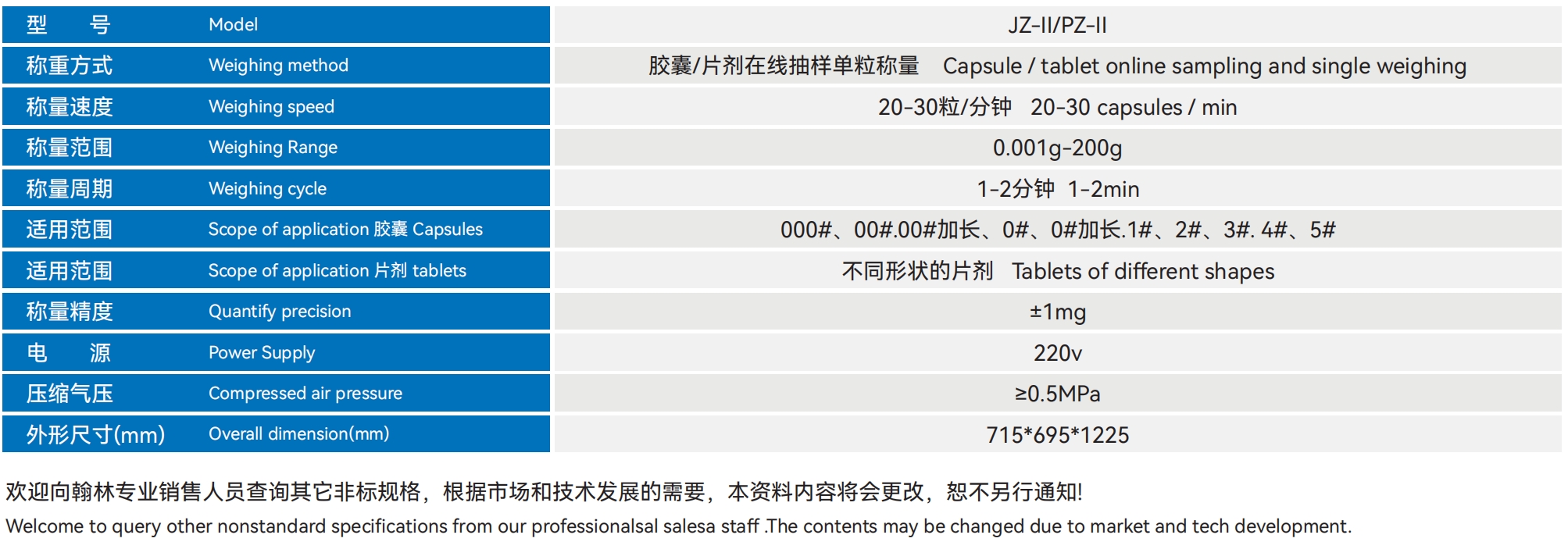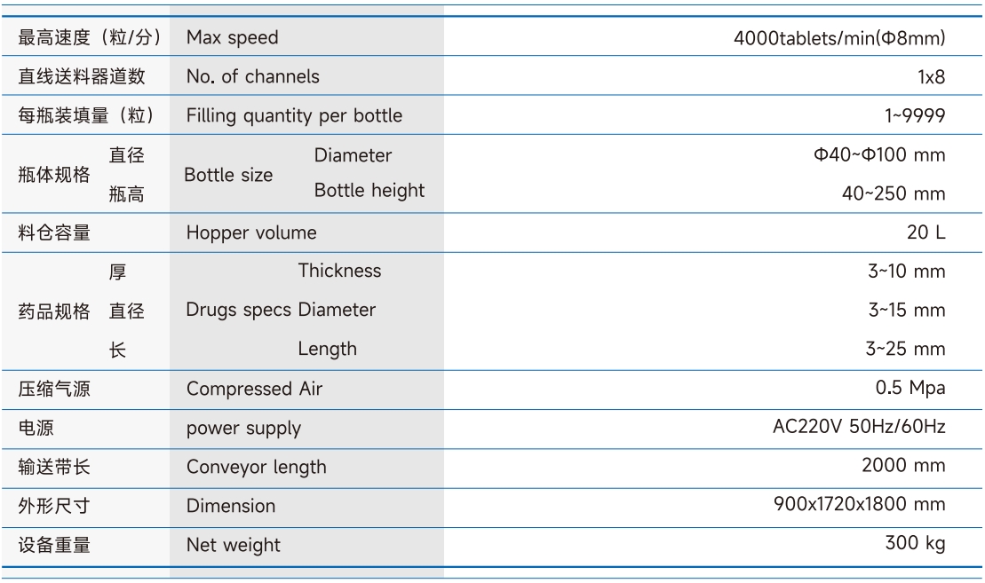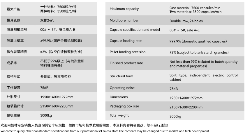 | 合用胶囊型号 | 最大出产效力 | 电源目标 | 紧缩氛围 | 形状尺寸 | 产物分量 | 料斗容积 | 保送速率 | 电源 | 形状尺寸 | 分量 |