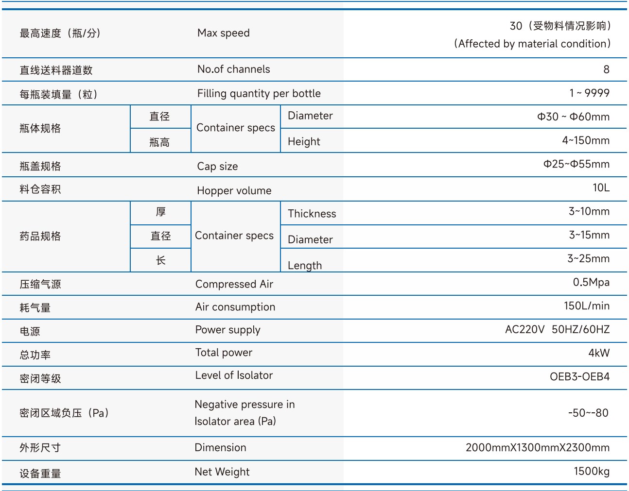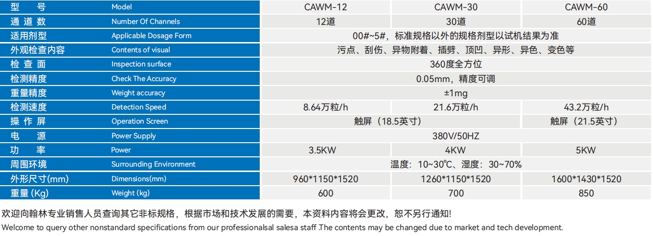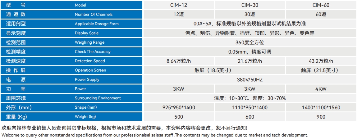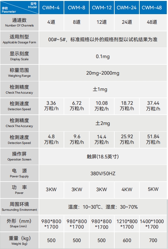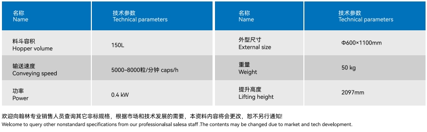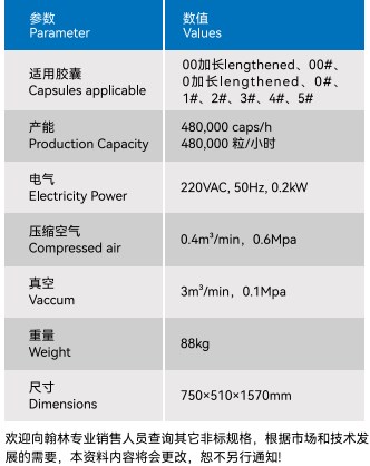 | 00#-4# | 480000粒/小时 | 200W 220V 50Hz | 0.3MPa | 740x490x 1500mm | 76kg | 150L | 8000粒/分钟 | 270W220V | 600 x1100mm | 50kg |